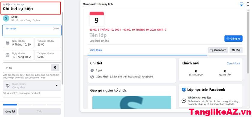 - Bước 4: Thiết lập thông tin cho sự kiện trên trang này.